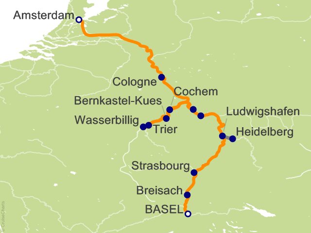 You have a choice of several excursions, depending on your interest. Visit Heidelberg, a perfectly preserved medieval city nestled in the Neckar River Valley along Germany's Castle Road. Alternatively, relive a bygone era on a tour of the glorious Baroque Schwetzingen Palace. Or, you may decide to visit Schwetzingen Palace Gardens with more than 100 sculptures and an assortment of whimsical buildings. The Apollotempel houses a statue of the ancient Greek god of light and the arts, playing the lyre; and the most spectacular, the Turkischer Garten with a mosque, are a few of the many highlights you will see. For a more active adventure while in Heidelberg, join a guided hike up the Philosophers' Path, aptly named during the Romantic Period, and be rewarded with panoramic views of the city. Later in the day, sail to Rudesheim where you can visit Siegfried's Mechanical Music Museum or taste one of the town's special delights, Rudesheim coffee, ceremoniously made with brandy. (B,L,D) ...
