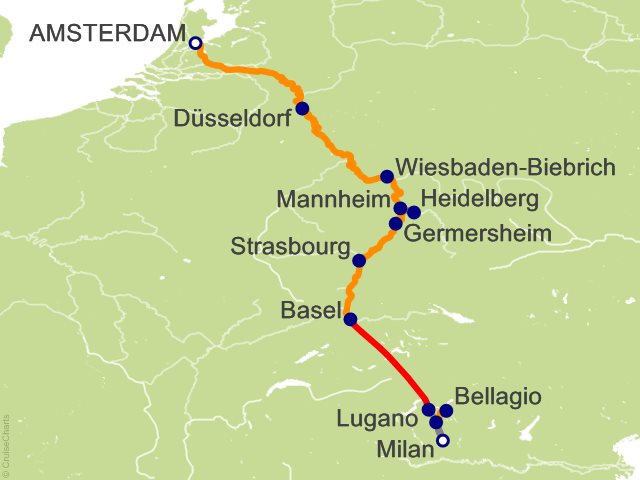 Tour begins: 4 PM, Amsterdam, Netherlands. Welcome to Amsterdam! Transfers are included from Schiphol Airport or Amsterdam Centraal Station to your riverboat, where embarkation will begin any time after 4 PM. Enjoy a welcome cocktail reception followed by a leisurely dinner as you settle into your floating hotel for a memorable weeklong cruise on the Rhine and a visit to Italy's sparkling Lake Como region and remarkable Milan. ...