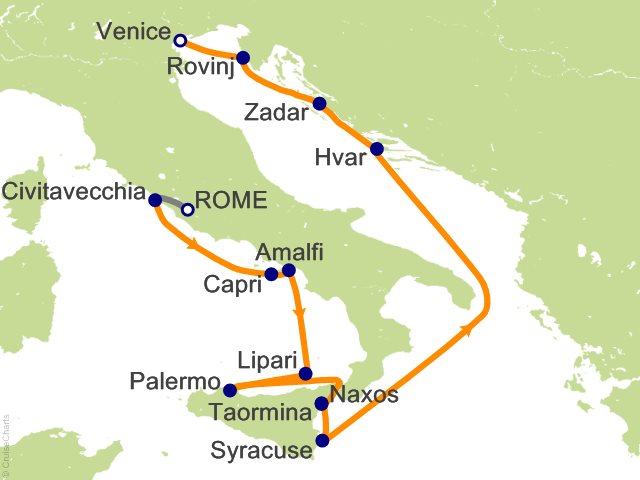 Arrive in Palermo, a vibrant and historic city located on the northern coast of Sicily. The island's capital reveals a mix of cultures, including Italian, Arabic, and Norman influences, which is evident in its diverse architectural styles and cuisine. Palermo's historic center is a UNESCO World Heritage-listed site, brimming with beautiful churches, palaces, and bustling squares. Palermo is also known for its street food scene, with markets like Mercato Ballaro and Mercato Vucciria serving up a wide range of local specialties, such as arancini, panelle, and sfincione. Sail through the dramatic Strait of Messina this evening, where Sicily and mainland Italy meet. Enjoy coastal views and a passage rich in history and legend. Inclusions: Breakfast, Lunch, Dinner. ...