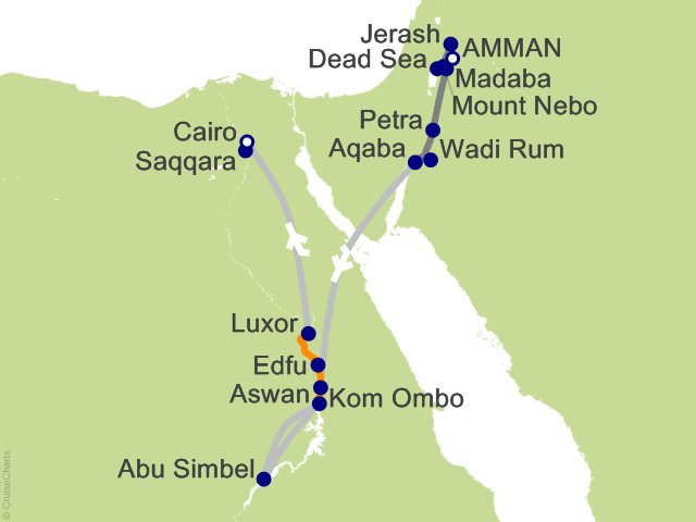 Take a morning excursion to the otherworldly landscapes of Wadi Rum, known as the Valley of the Moon for the lunar-like dunes and towering sandstone cliffs found here. Exploring by 4x4 vehicle makes your visit unforgettable. Fly from Aqaba to Aswan, then drive to your hotel on the banks of the Nile, a Victorian palace once frequented by royalty, heads of state - and Agatha Christie; have dinner at your leisure. ...
