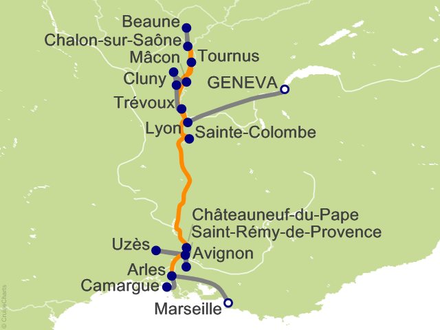 Chalon-sur-Saone on the River Saone lies in the heart of southern Burgundy. Although its history dates back to the time of Charlemagne, it has another significant claim to fame - this is considered the birthplace of photography. So you have local inventor Nicephore Niepce, who started it all with several photographic firsts right here in the 1820s, to thank for the great photos of the town's Romanesque churches and other monuments. Visit the walled city of Beaune - the "wine capital" of the famous Burgundy wine-producing region, and one of France's most important wine centers. A walking tour includes a visit to Hospices de Beaune or Hotel-Dieu de Beaune, considered one of the best-preserved examples of 15th-century French architecture; you may also see the old market (Les Halles), the Beffroi (clock tower), parts of the medieval walls and ramparts, and more - or you can do a bicycling excursion if you prefer. This afternoon, you have a choice of wine tasting in Burgundy or a walking tour (and tasting tour) of Chalon-sur-Saone. ...