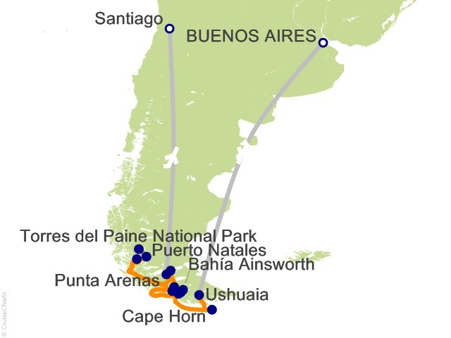 Sailing the turquoise waters of the extraordinary stretch of coastline leading to the small port of Puerto Natales, we'll meander through a mesmerizing maze of deep, windswept fjords, narrow channels, and isolated bays, with an eye toward the rugged landscape, unique wildlife, and impressive glaciers that tumble from the towering mountains into the icy waters below, along with the imperial and king cormorants, South American terns, black-necked swans, and southern wigeons (Chiloe wigeons) that frequent the fjords. Torres del Paine National Park is one of the most stunning wilderness areas in South America, and Puerto Natales is the gateway. This enormous park is a UNESCO Biosphere Reserve, so designated for both its natural wonders and ancient human history, and named for the three granite peaks that tower above the glacier-fed lakes. Enjoy a day of hiking, and exploration aboard chartered buses tailored to your preferred activity level with lookouts in the park, followed by traditional Patagonian cuisine in the afternoon. Taking our expedition onto dry land for another full day, we will also visit a working Patagonian estancia ("ranch"), founded in 1891 by Scottish immigrants. Here you will learn about Patagonian sheep farming in a historic pastoral setting. You may be lucky enough to spot in the surrounding grasslands wildlife such as ostrich-like rhea, and guanacos, a wild relative of the domestic llama. Complete your cultural experience with a lunch of barbecued lamb al palo ("on a stick"), and return to the ship in the early evening. ...