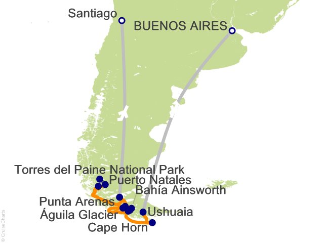 After an adventurous two weeks of exploration, you'll say goodbye to your Expedition Team and disembark in Punta Arenas, to be transferred to the airport for your charter flight to Santiago which is included in your Charter Flight and Hotel Package. Upon arrival at the airport, you are welcome to continue on your own travels or connect to your homeward flights. ...