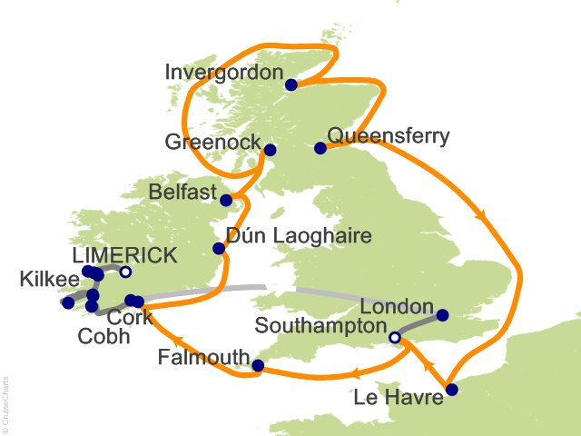After breakfast, transfer to Cork Airport for your flight to London (Heathrow). Upon arrival, transfer to Southampton to embark your ship. (B)