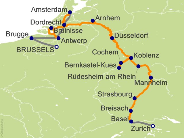 Your cruise concludes this morning in Basel. Enjoy one final breakfast onboard, then disembark and transfer to Zurich Airport, taking with you lifelong memories of a remarkable journey across a continent. Please book your flight to depart out of Zurich after 11:30 AM.