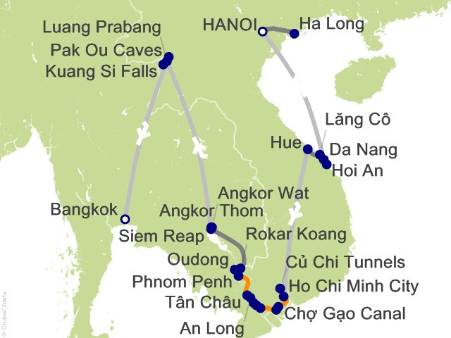 This morning after breakfast, bid farewell to Laos and transfer to the airport for your included flight to Thailand and its vibrant capital, Bangkok, where your extraordinary Indochina journey ends. Please book your flight to depart out of Bangkok after 7 PM.; Notes: Rivers and waterways are subject to variations in water levels. While every effort is made to adhere to the planned itinerary, changes in river conditions, ad hoc local government regulations, or local festivities may require journey modifications. These will be made based on the advice of local authorities or for safety reasons. Hotels are indicative and are subject to change. ...