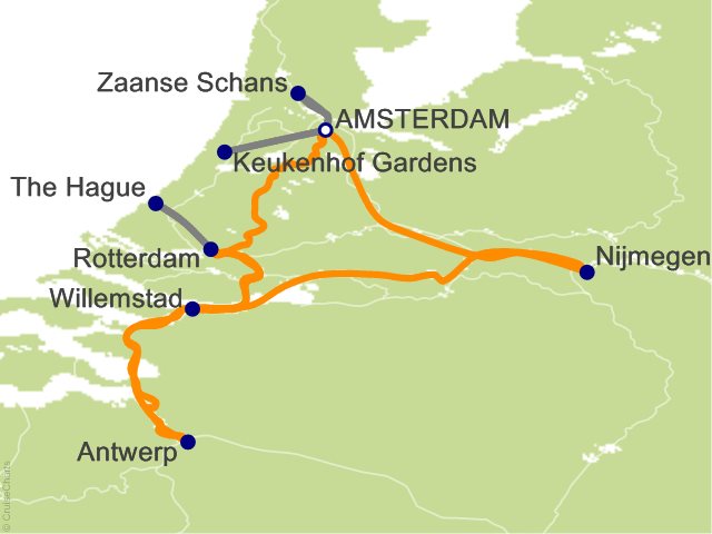 This morning, you'll arrive in Belgium's largest port of Antwerp. Located on the River Scheldt, the city's large harbor provides a link to the sea. Home to the famous Baroque artist Pieter Paul Rubens, Antwerp attracts art-lovers from all over the world. Enjoy a guided tour of the city center, with its cafe-lined cobbled lanes. Admire the Renaissance city hall and Het Steen, a medieval fortress that was built during the early Middle Ages and one of the oldest buildings in Belgium. Afterwards, enjoy free time to explore Antwerp at your leisure. ...