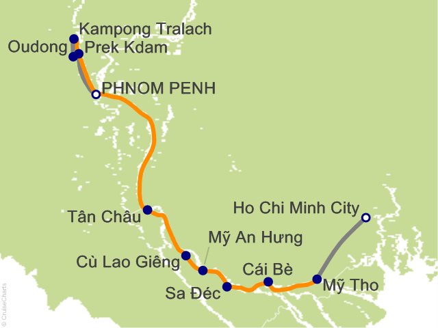 After sailing from My Tho, you'll leave the Mekong Delta and enter the Cho Gao canal, considered one of Vietnam's major arterial canals that connects Tien Giang Province with Ho Chi Minh City. Today, you'll be fascinated watching the heavy commercial traffic navigating this important waterway, where upwards of 1,800 vessels transit each day. Relax onboard, taking in the everchanging vistas of mangroves, cargo barges, and local fishing boats. Tonight, you'll dock in the heart of Ho Chi Minh City, where you can admire the city lights; due to Vietnamese customs regulations, you'll not be permitted to venture ashore. ...