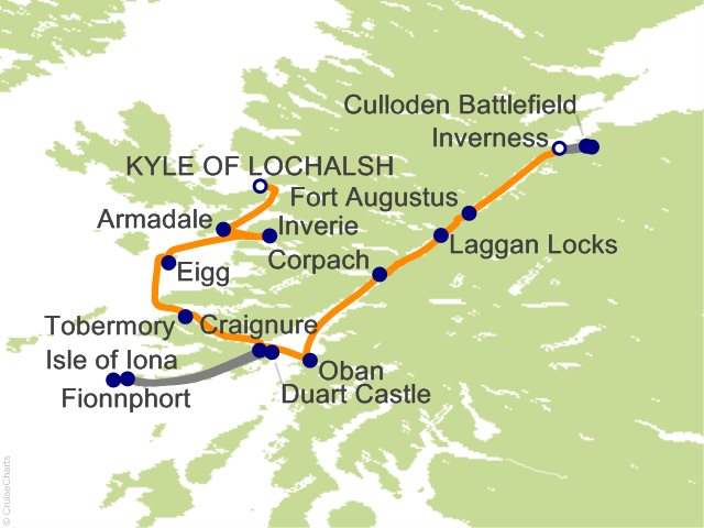 This morning, explore Kyle of Lochalsh, where you'll set out on a guided walk affording spectacular coastal and mountain views. Or explore Eilean Donan Castle, a one-of-a-kind landmark stacked on a tidal island at the confluence of three lochs. In Armadale this afternoon, visit the Museum of the Isles and trace the legacy of the 1,300-year-old Clan MacDonald-the Lords of the Isles who once ruled the west coast of Scotland. Survey the ruins of Armadale Castle, the MacDonald's ancestral home, and ramble through its beautiful woodlands and gardens. Back aboard Lord of the Glens, sail to the tiny village of Inverie where you'll stop at the community-owned and operated Old Forge, the most remote pub in the British Isles. Chat with Inverie's residents over a pint of local ale, or head out on a coastal or inland bog walk on which you'll have the opportunity to see highland horses. ...