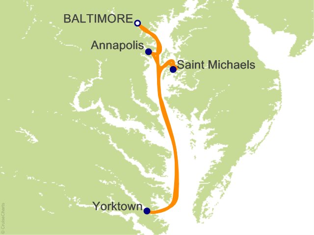 Bask in the beauty of Chesapeake Bay as you cruise along serene and picturesque landscapes and charming waterfront communities. Pass by lush shorelines and small islands that showcase the region's natural beauty. From the comfort of your private balcony, enjoy the opportunity to spot birds, dolphins, and other marine life. As we voyage, onboard specialists will enrich your journey with insights into the local culture and heritage. Take a moment to unwind on your personal balcony or join in the fun of kite flying on the upper deck. Come evening, mingle with other guests and revel in the talents of some of the region's best entertainers. ...