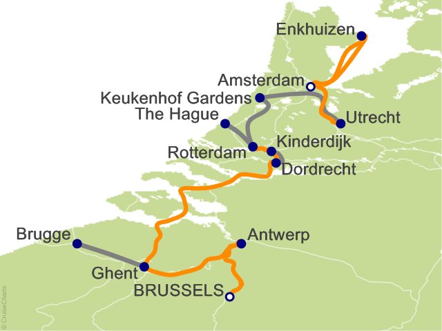 You're off this morning for a flower-filled visit to Keukenhof Gardens in nearby Lisse, where you will discover "the most beautiful spring garden in the world". A rolling carpet of color, Keukenhof is one of Europe's most iconic - and fragrant - places to witness springtime in all its glory. For eight springtime weeks every year, more than seven million tulips, daffodils, and hyacinths blanket the 80-acre landscape with color and fragrance unequaled anywhere. Your visit here offers you a choice: One option has you explore the illustrious gardens on foot; the other takes you on a bike ride around the gardens (note: this bike ride does not take place in the gardens) finishing with a bit of time to walk the gardens. Spend the morning here and have lunch. Return to your ship this afternoon, now docked in Utrecht, and cruise on to your final destination, Amsterdam. ...