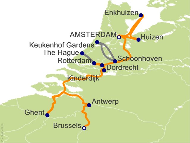 Explore Amsterdam today, blending past with present, from its medieval core to the bustling shops, cafes, and rich cosmopolitan life of a 21st-century European metropolis. Disembark for a choice of excursions; one takes you on guided canal boat cruise under the curved bridges and past merchants' homes along the 17th-century grachten (canals) of the city. The three main canals, dug during the Dutch Golden Age, form concentric belts around the city, and are resplendent with 1,550 monumental buildings. Your cruise ends with a guided tour of the Rijksmuseum to see works by the Old Dutch Masters, including Rembrandt, Vermeer, and Van Gogh. Alternatively, enjoy a full-day excursion to the Dutch countryside, complete with a guided tour of a tulip and vegetable nursery. Your final choice offers a day of exploration in nearby Huizen (where your ship is docked). Your ship departs early this afternoon, allowing you ample time to enjoy the weather and take in the sights as the Dutch countryside passes you on both sides. Your ship arrives early this evening in Enkhuizen. ...