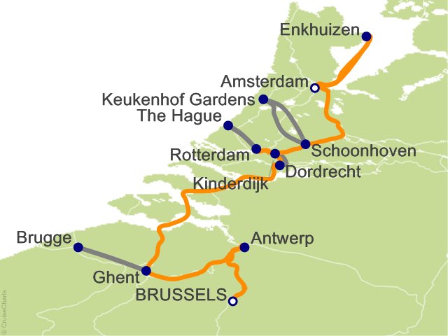 You're off this morning for a flower-filled visit to Keukenhof Gardens in Lisse, where you will discover "the most beautiful spring garden in the world". A rolling carpet of color, Keukenhof is one of Europe's most iconic - and fragrant - places to witness springtime in all its glory. For eight springtime weeks every year, more than seven million tulips, daffodils, and hyacinths blanket the 80-acre landscape with color and fragrance unequaled anywhere. Your visit here offers you a choice. One option has you explore the illustrious gardens on foot; the other takes you on a bike ride around the gardens (Note: this bike ride does not take place in the gardens) finishing with a bit of time to walk the gardens. Spend the morning here and have lunch. Return to your ship this afternoon, and cruise on to your final destination, Amsterdam. ...